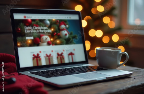 Online shopping for Christmas gifts, laptop screen with holiday-themed website, cup of hot cocoa and fairy lights in the background