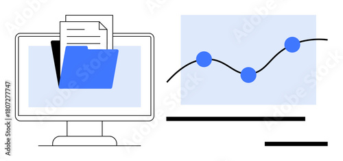 Open file folder on monitor alongside a line graph with plotted points. Ideal for data analysis, file organization, business analytics, report generation, tech interface, productivity, simple flat