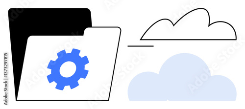 Open folder with gear icon symbolizing configuration next to outlined and filled clouds. Ideal for technology, cloud computing, file sharing, data backup, storage management, synchronization, digital