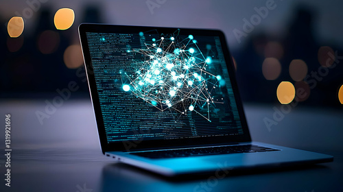 Open Laptop Displaying Code And Data Visualizations With A Blurred City Lights Background At Night