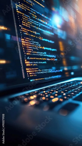 Open laptop with coding on the screen, the word 'Development' in the code