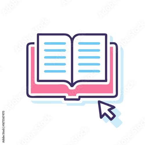 Open pink book with cursor arrow in flat colorful vector