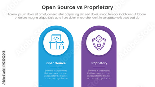 open source vs proprietary software comparison concept for infographic template banner with round shape on top vertical box with two point list information