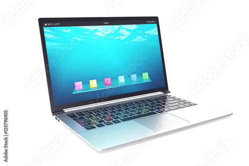 Opened notebook with blue underwater wallpapers isolated on white background. 3d illustration
