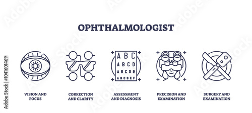 Ophthalmologist icons outline key concepts, vision, correction, examination, transparent background. Outline icons set.