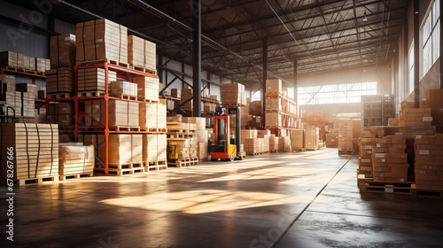 Organized Modern logistic Warehouse Interior with Stacked Pallets, Forklifter and Boxes