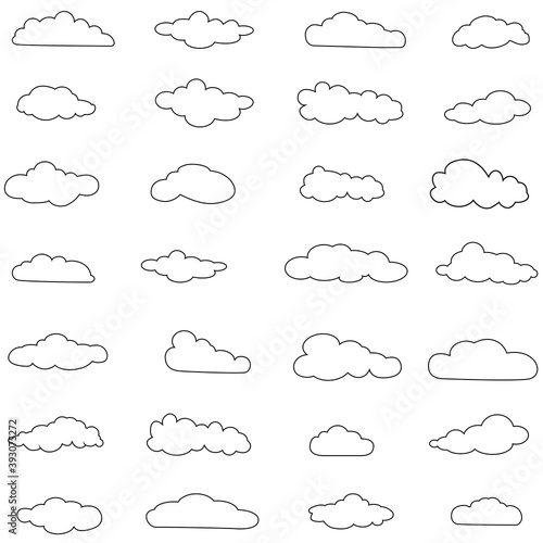 Outline cloud icons set isolated on white background. Collection of different black clouds. Cartoon contour icons for web site, background template, wallpaper and sky design. Clouds thin line vector