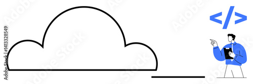 Outline of a cloud paired with coding marks and a developer pointing, holding a document. Ideal for technology, programming, cloud infrastructure, data storage, IT solutions, digital transformation