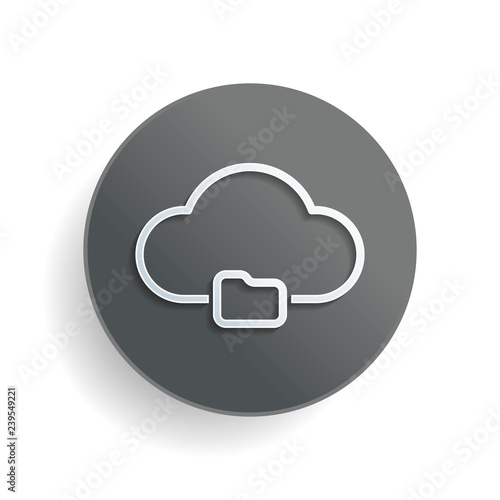 outline simple cloud and folder. linear symbol with thin outline. White paper symbol on gray round button or badge with shadow