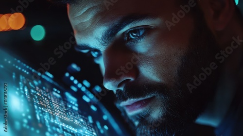 Over shoulder closeup view man IT coder programmer software engineer use laptop computer typing code develop program programming java language application on screen web system app development concept