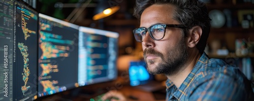 Over the shoulder view of a coder intensely working on multiple computer monitors filled with programming code