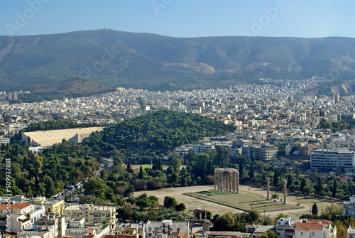 Overhead view of Athens, Greece, with a park with ancient columns in the center