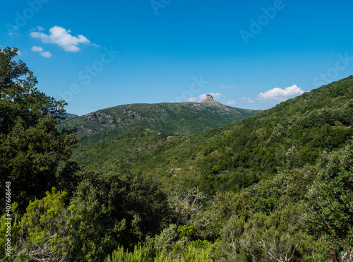 Overview of the National Park of Barbagia with limestone tower of Perda Liana, impressive rock formation on green forest hill, sardinian table mountain. Central Sardinia, Italy, summer day