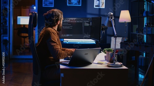 Overworked developer complaining while typing difficult code in home office, developing software application. IT expert groaning while solving coding project tasks, suffering from burnout, camera B