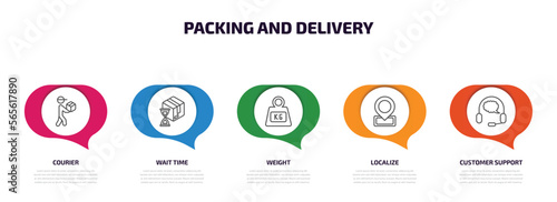 packing and delivery infographic element with outline icons and 5 step or option. packing and delivery icons such as courier, wait time, weight, localize, customer support vector.