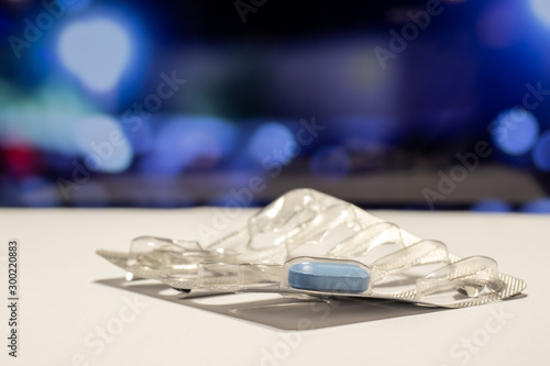 Packing tablets with one remaining tablet. Close-up on a colored background.
