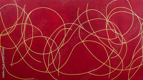Painting featuring gold lines on a vibrant red background with abstract design elements
