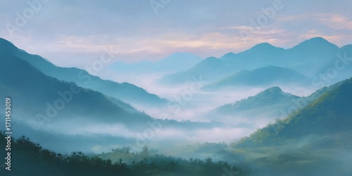 Painting of a mountain range with a pink sky