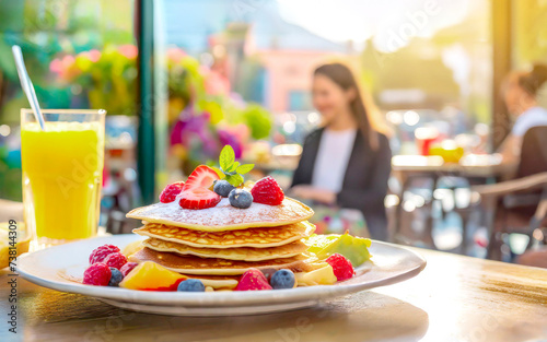Pancake mit Früchten, im Hintergrund ein Cafe