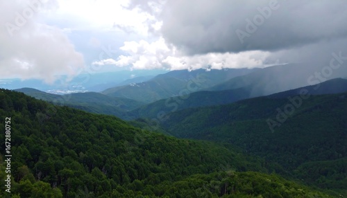 Panoramic aerial view showcasing the lush Smoky Mountains under stormy skies