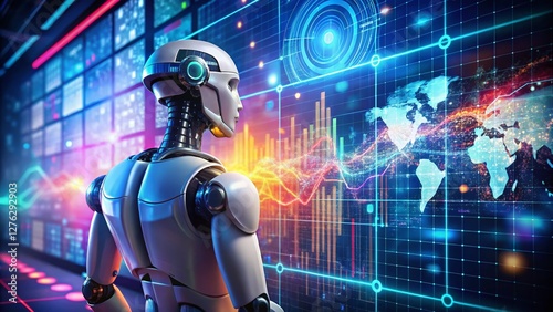 Panoramic Futuristic AI Robot Data Analysis: Advanced Technology & Digital Screen