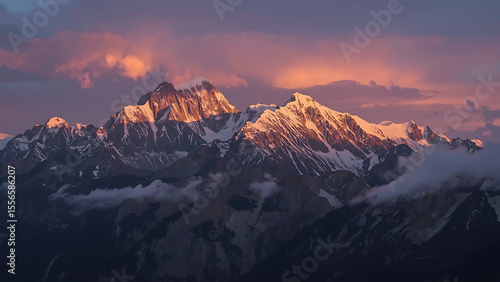 Panoramic mountain landscape at sunrise with snow-capped peaks under a vibrant sky