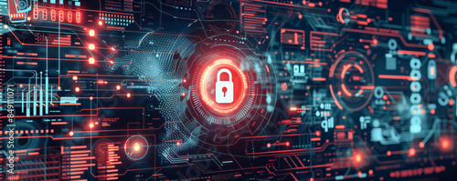 Panoramic view of padlock on the motherboard. Computer code, data security and password concept.