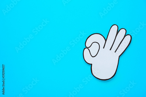 Paper cutout of okay hand gesture on light blue background, top view. Space for text