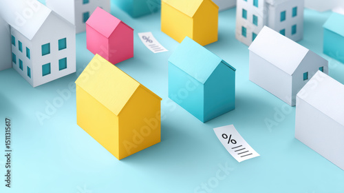 Paper houses in yellow blue and pink colors with interest rate papers symbolize property loan and financial concept