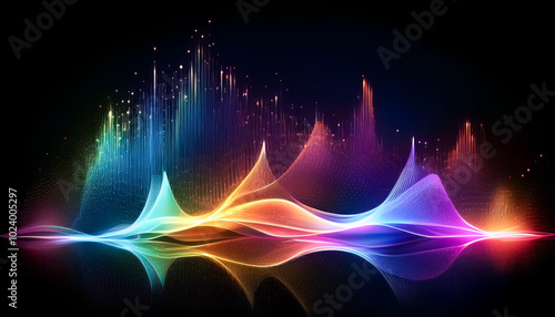 Particle, light, wave, sound, climb, rise, digital, sway, move, shine, flow, effect, wallpaper, black background, illustration, design