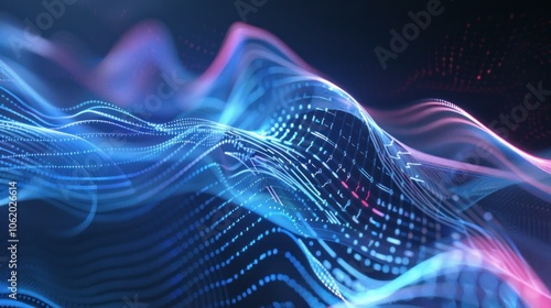 Particles form surface lines and lattices. 3D rendering, glowing particles science fiction background