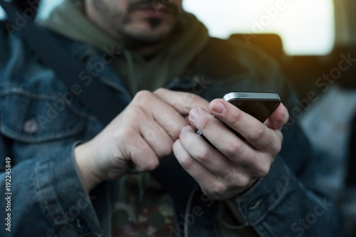 Passenger of a car with seat belt handling mobile phone with cell phone blouses and jacket cold.
