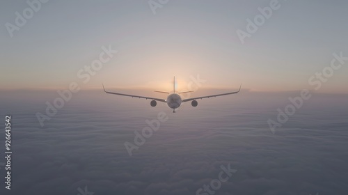 passenger reactive plane off from an airport runway at sunset or dawn with the landing gear down