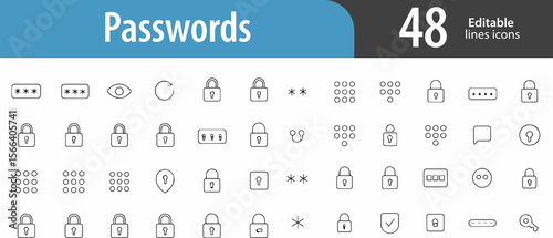 Passwords Line Icons, Lock, Asterisk, Key, Hidden Text, Password Input, Editable Formats: AI, EPS, PNG, JPG, Ideal for Both Digital and Print Use