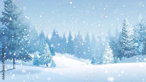 Pastel Blue Winter Forest: Snow-Covered Evergreen Trees with Falling Snowflakes on Soft Bokeh Background