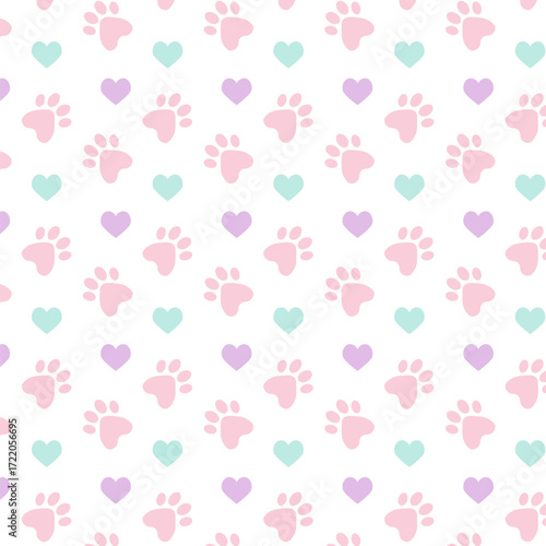 pastel color seamless pattern with cute paws and hearts