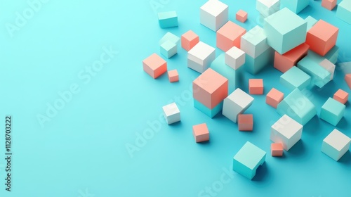 Pastel colored cubes scattered on a light blue background.
