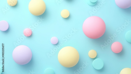 Pastel colored spheres scattered on a light blue background creating a soft texture.