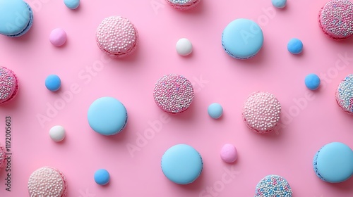 Pastel macarons and candies on pink background; food photography, recipe blog, website