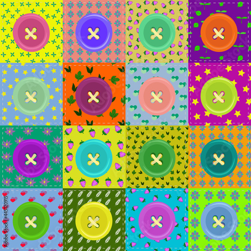 Patchwork background with colorful sewing buttons. Vector illustration.