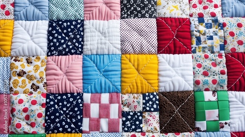 Patchwork quilt with many different colored squares. The quilt is made up of many different pieces of fabric, and the colors and patterns are very diverse. The quilt appears to be very colorful