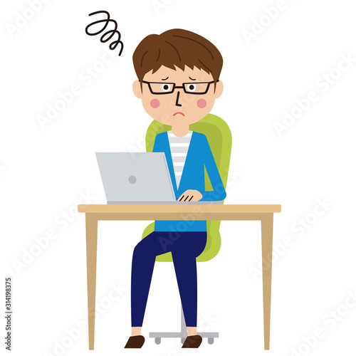 ポップな眼鏡の若い男性 PC操作しながら 困る 全身