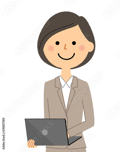 ノートPCを持つスーツの女性