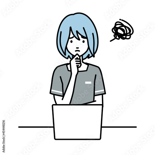 デスクで座ってPCを開いて困っているエステ店員の女性