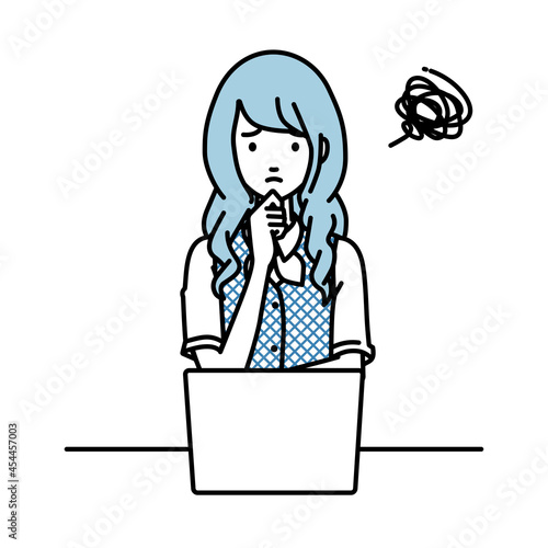 デスクで座ってPCを開いて困っている事務員制服の女性
