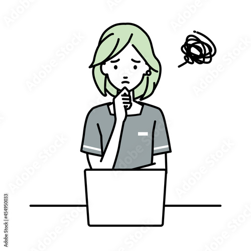 デスクで座ってPCを開いて困っているエステ店員の女性