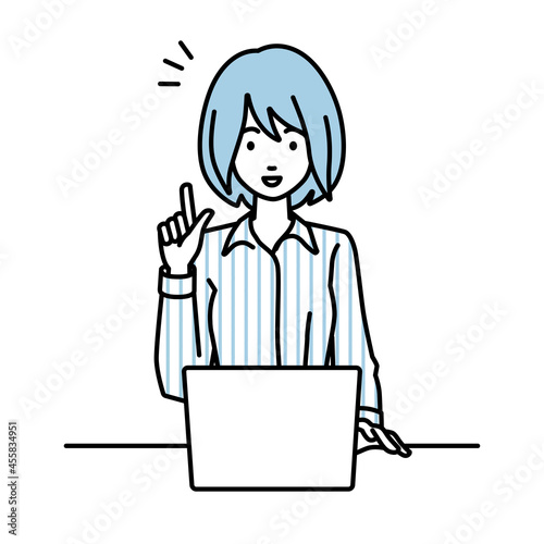 デスクで座ってPCを開いて何かひらめいたブラウスの女性