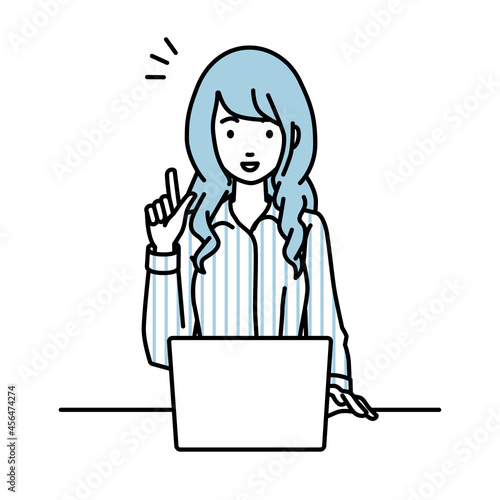 デスクで座ってPCを開いて何かひらめいたブラウスの女性