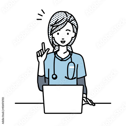 デスクで座ってPCを開いて何かひらめいた看護師の女性