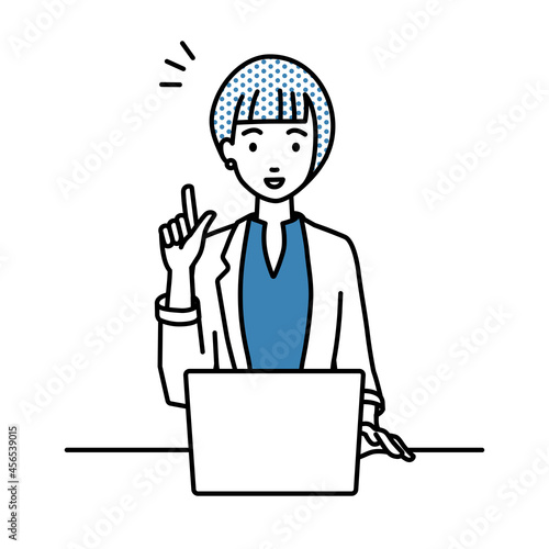 デスクで座ってPCを開いて何かひらめいたジャケットの女性